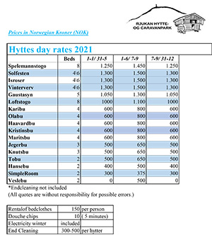 You can also choose to have the cleaning done by us. It will cost you between NOK 250,-- and NOK 500,-- depending on the reserved hytte.